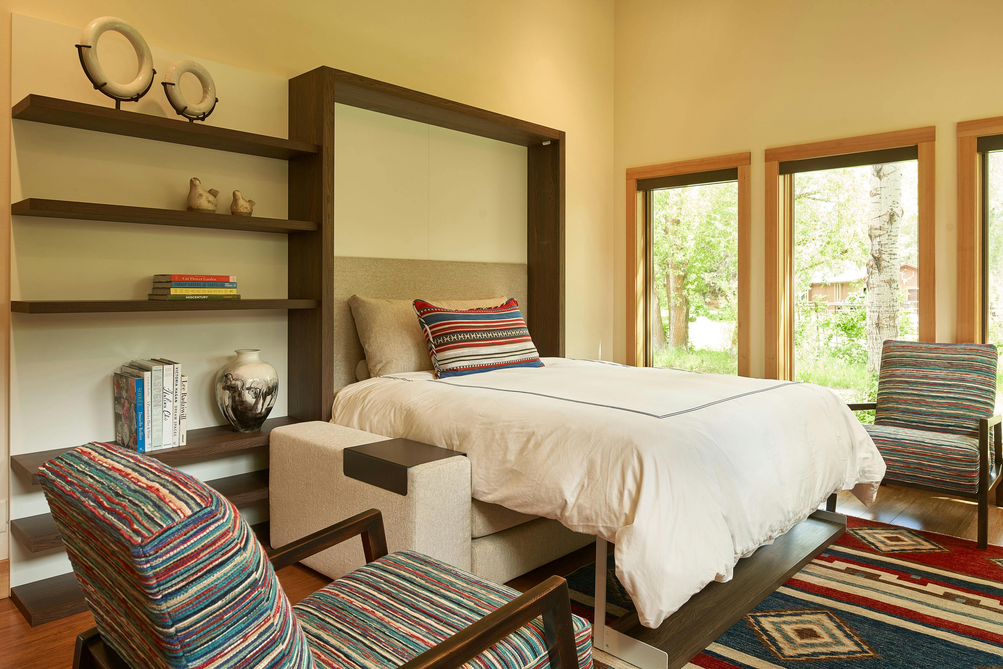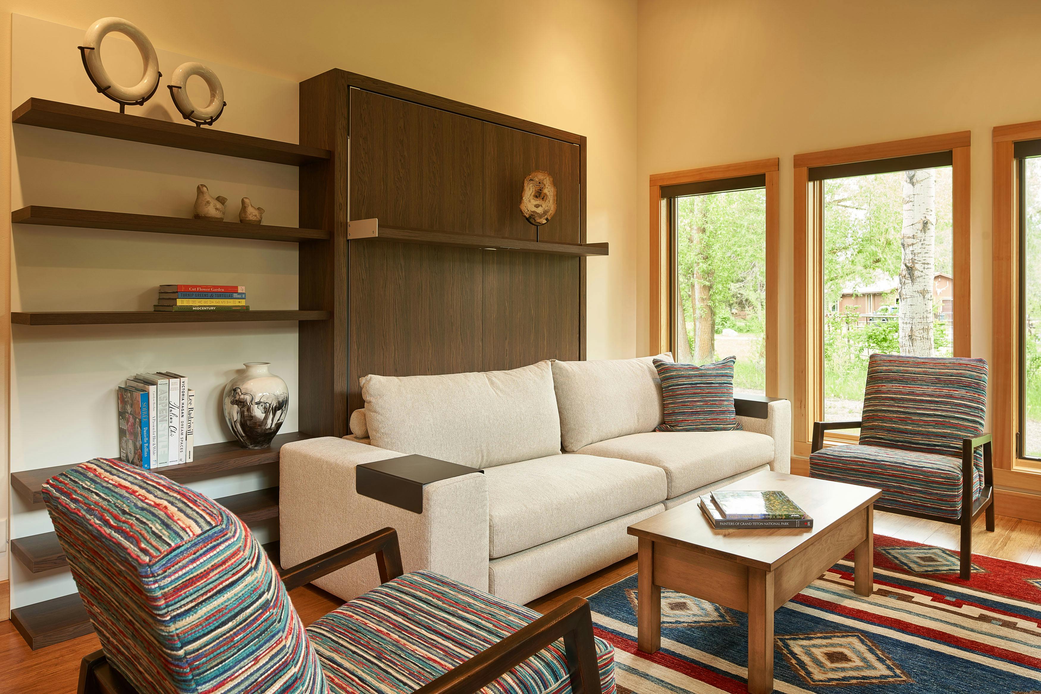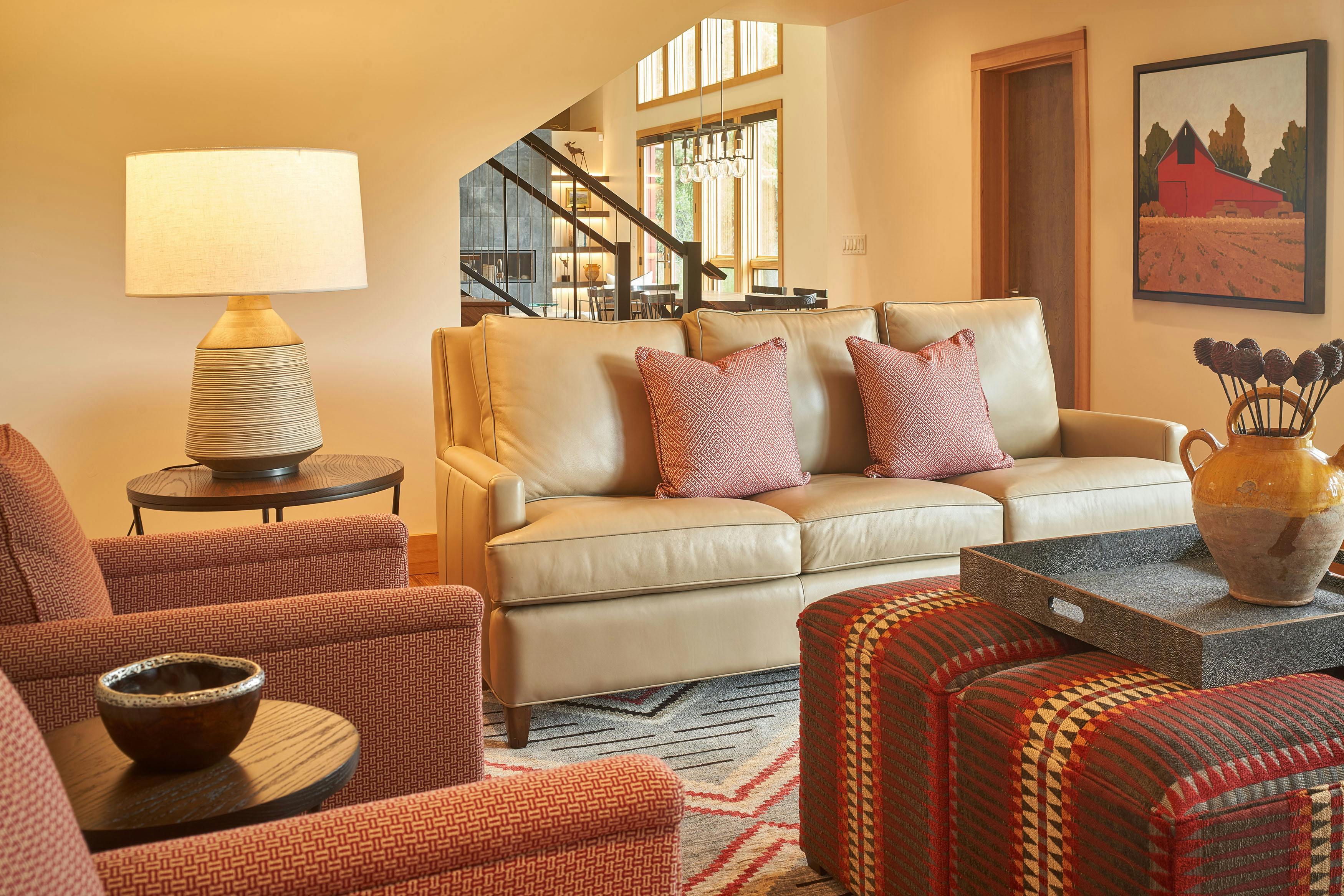 COLOR!! Our design started by adding pattern and color to the blank palette with bright area rugs that grounded the spaces. In the large great room, we created an architectural focal point with the linear fireplace and built-in bench and shelves. This provided a comfortable area for our clients to entertain guests. The comfortable furnishings throughout this spacious residence were a mix of modern, industrial, and retro-inspired. The contemporary western artwork brought in just the right amount of Jackson Hole flavor.
