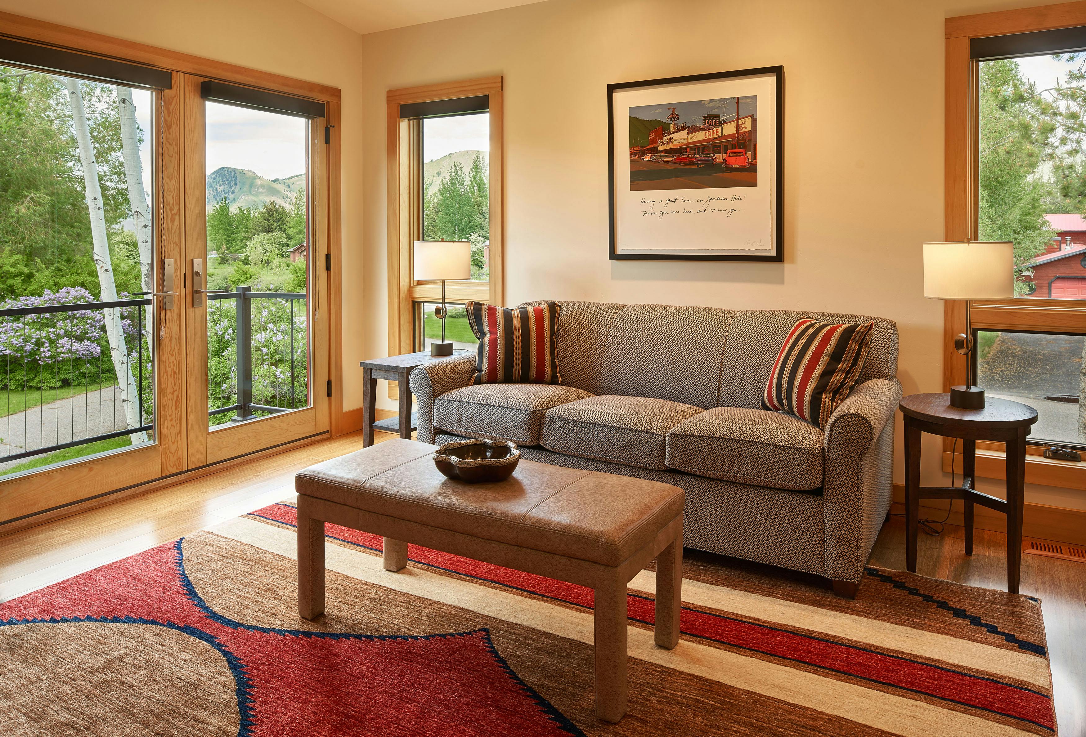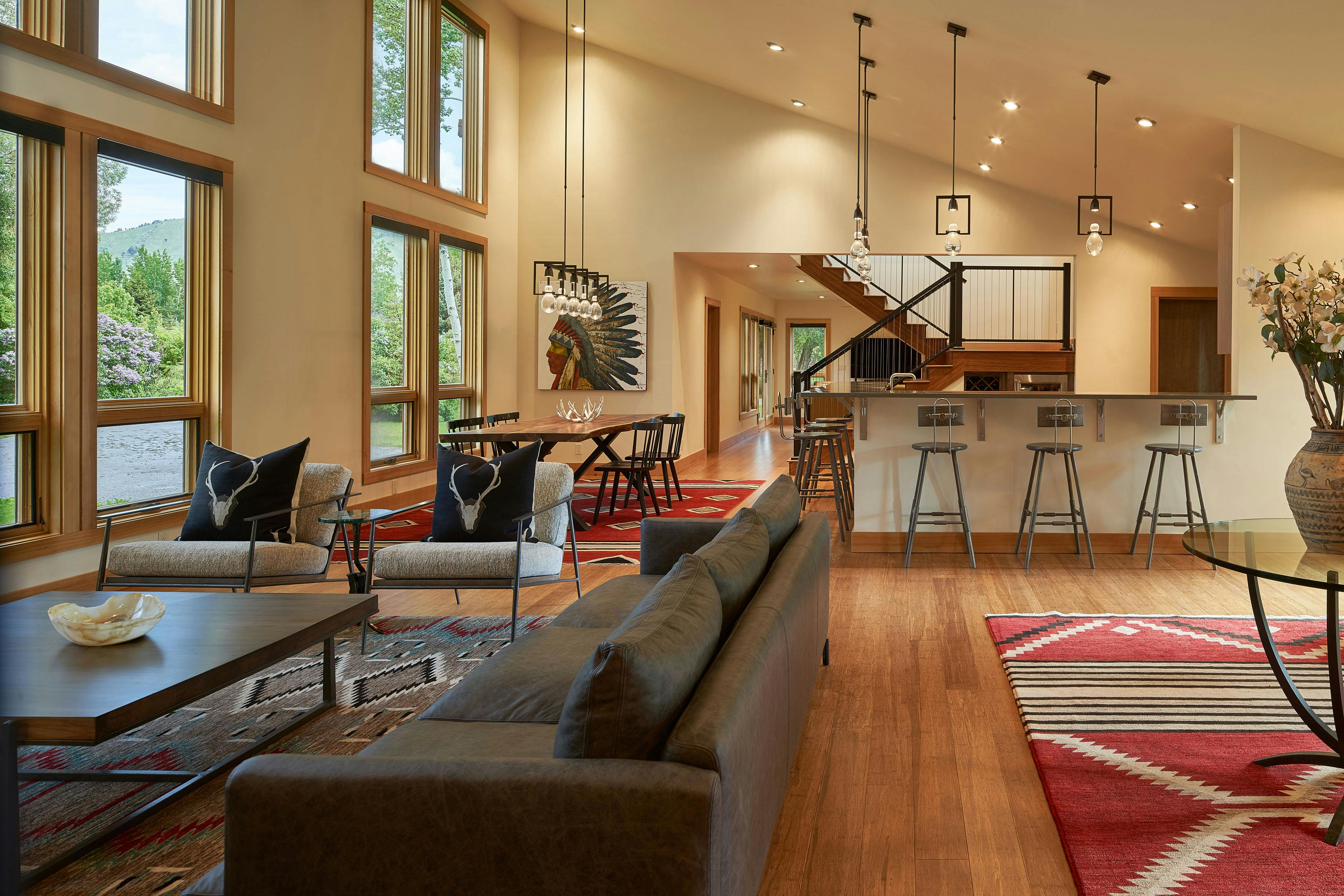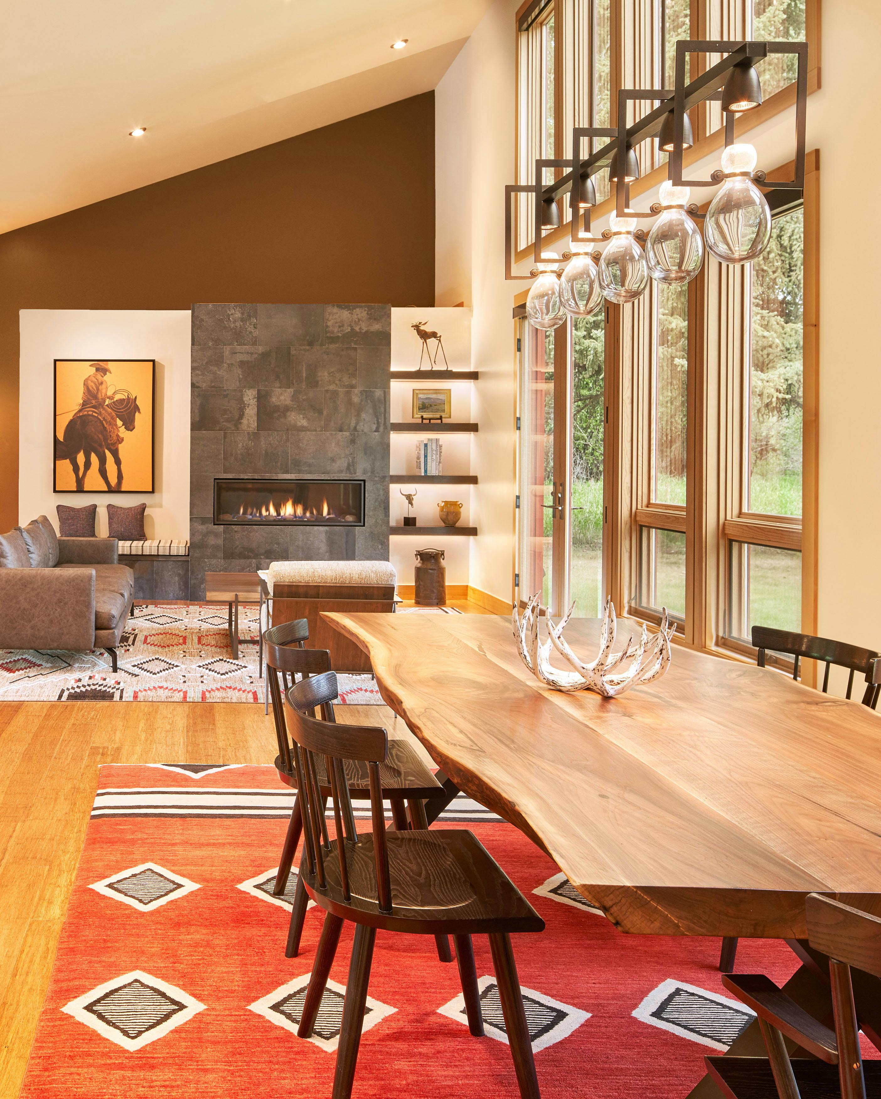 COLOR!! Our design started by adding pattern and color to the blank palette with bright area rugs that grounded the spaces. In the large great room, we created an architectural focal point with the linear fireplace and built-in bench and shelves. This provided a comfortable area for our clients to entertain guests. The comfortable furnishings throughout this spacious residence were a mix of modern, industrial, and retro-inspired. The contemporary western artwork brought in just the right amount of Jackson Hole flavor.