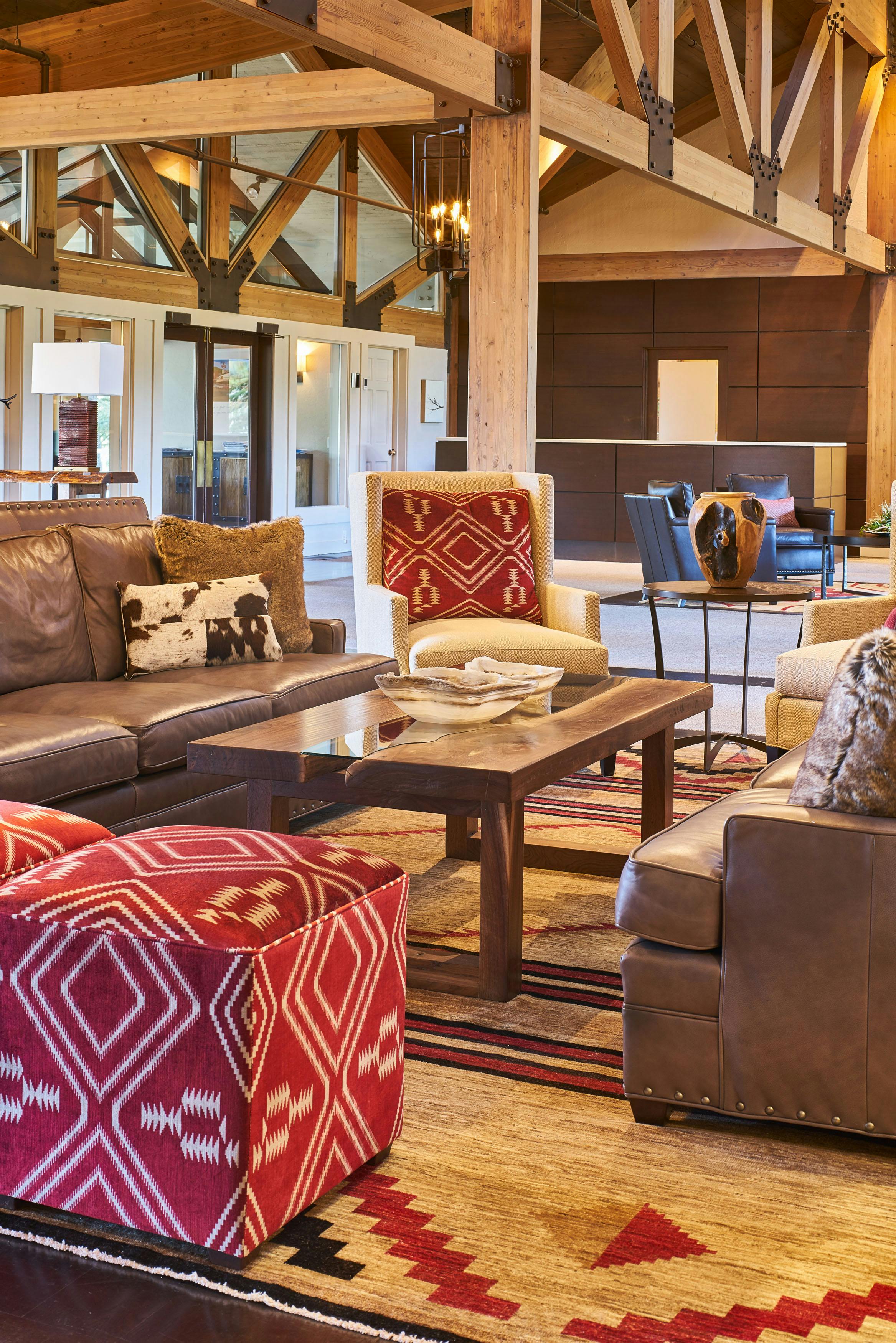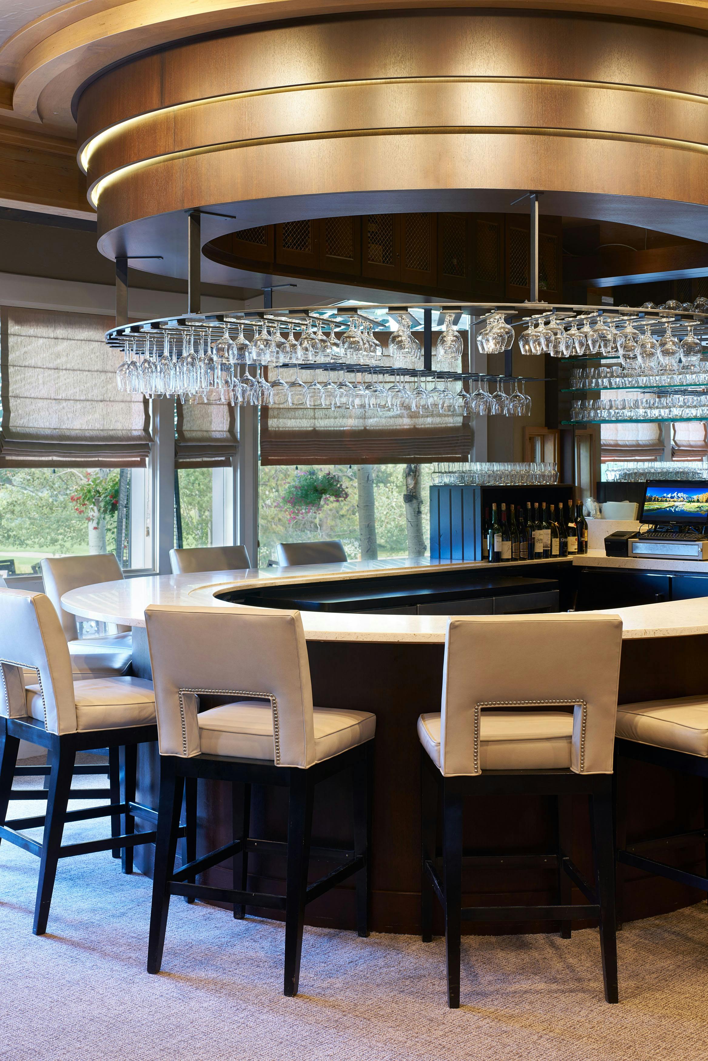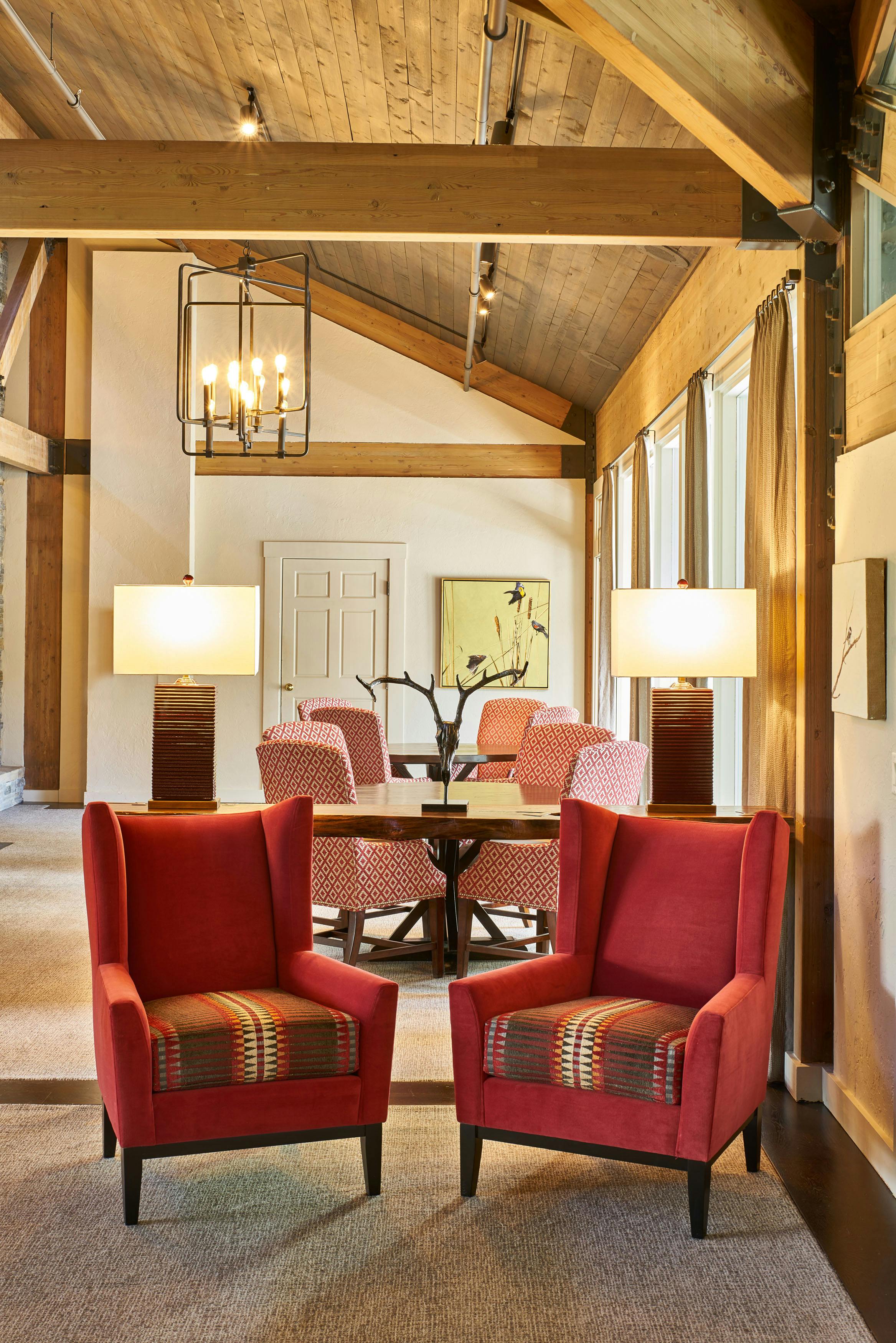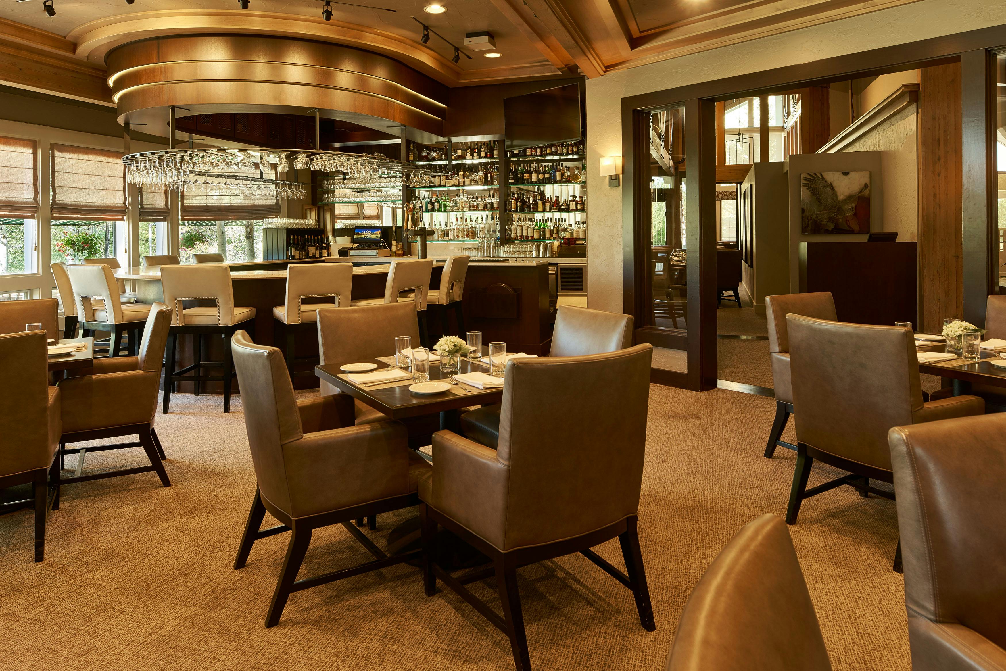 The members of Teton Pines were on a mission. They wanted to transform their traditionally adorned clubhouse into a transitional mountain retreat for current and new members. As is true with all commercial projects, adhering to a budget that allowed them to get the most value for their investment was extremely important. To help with costs, we kept the floor plan of the clubhouse the same but added more contemporary architectural elements and furniture with a warm taupe/red color palette. The dated river rock fireplace was replaced with a contemporary stacked stone. The bar was updated by refacing the perimeter in beautiful dark walnut, adding a crisp off-white veined quartz top, and installing a locally made custom-designed floating iron glass rack above the bar. The furnishings were replaced with sturdy, contemporary pieces that allowed their members to enjoy intimate spaces for dinner and cocktails.