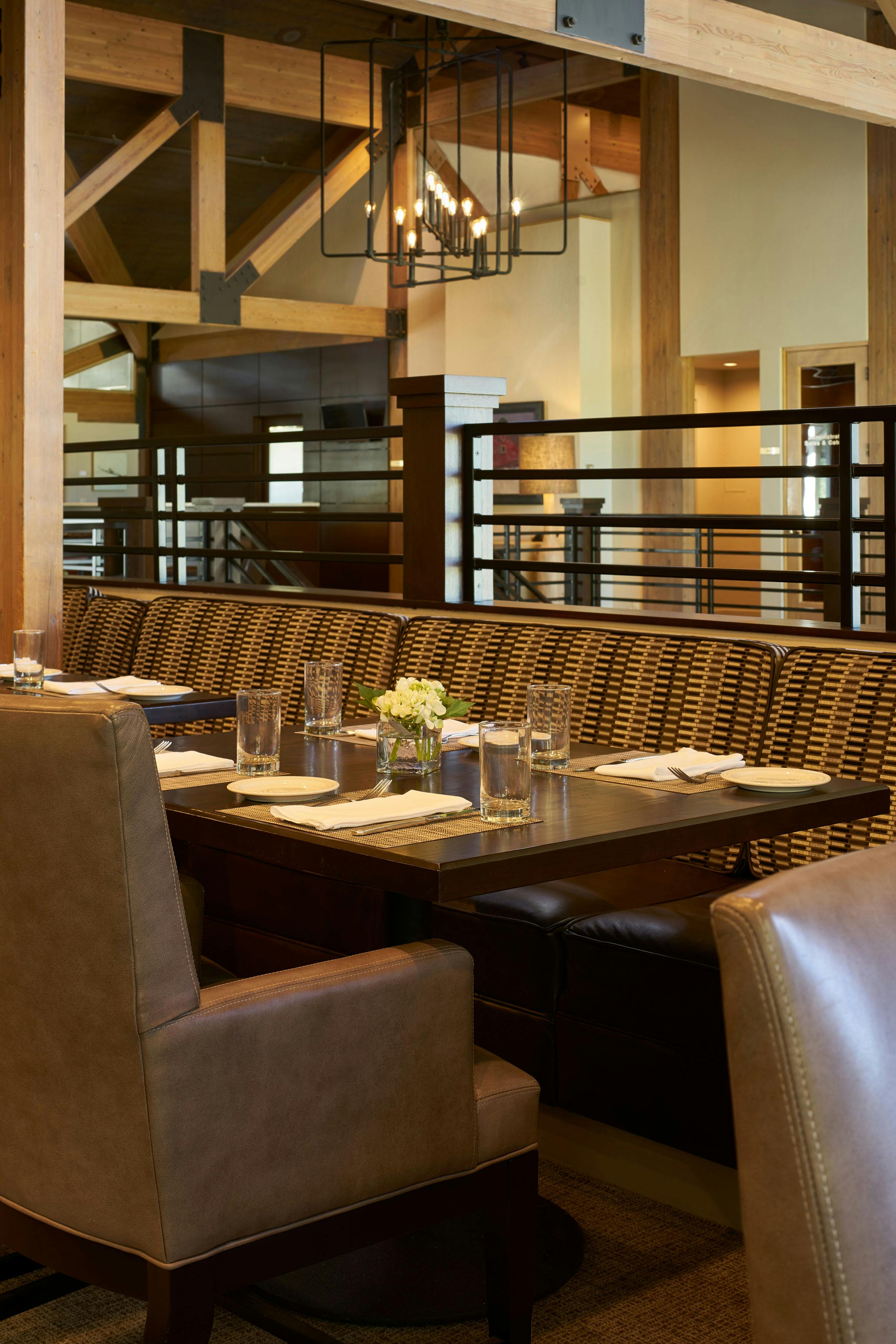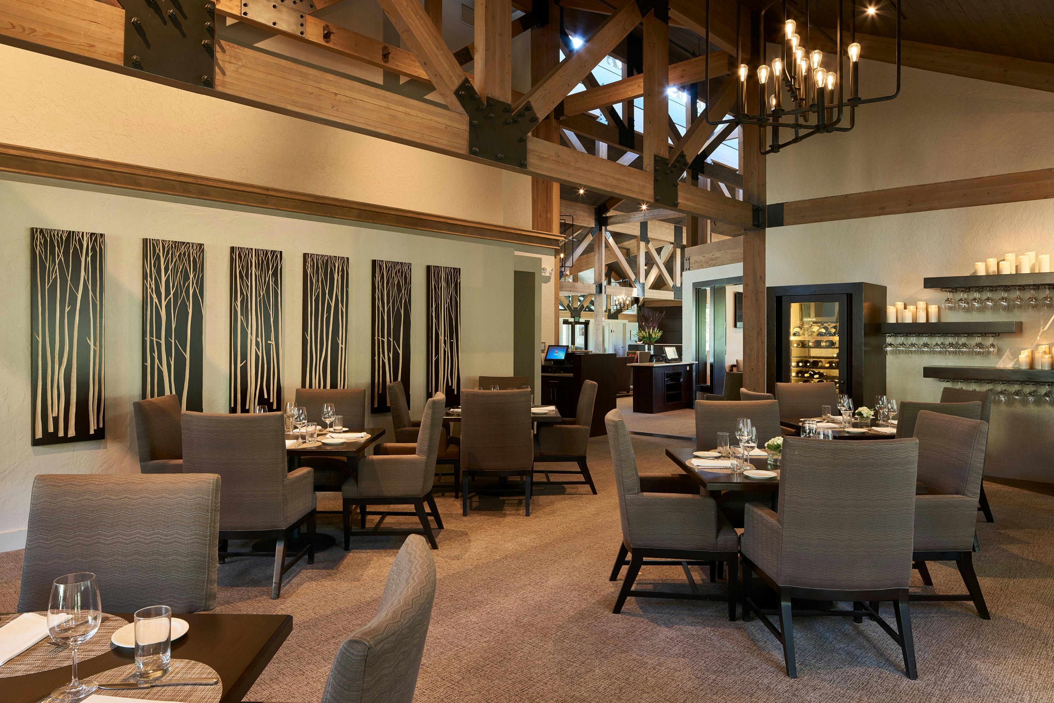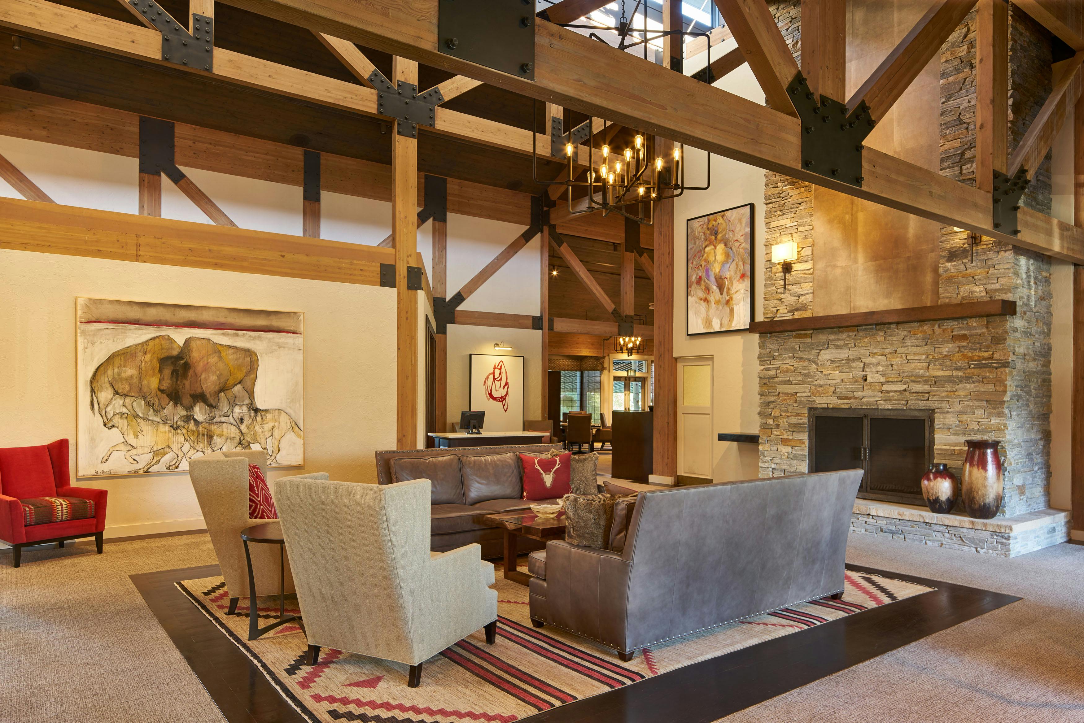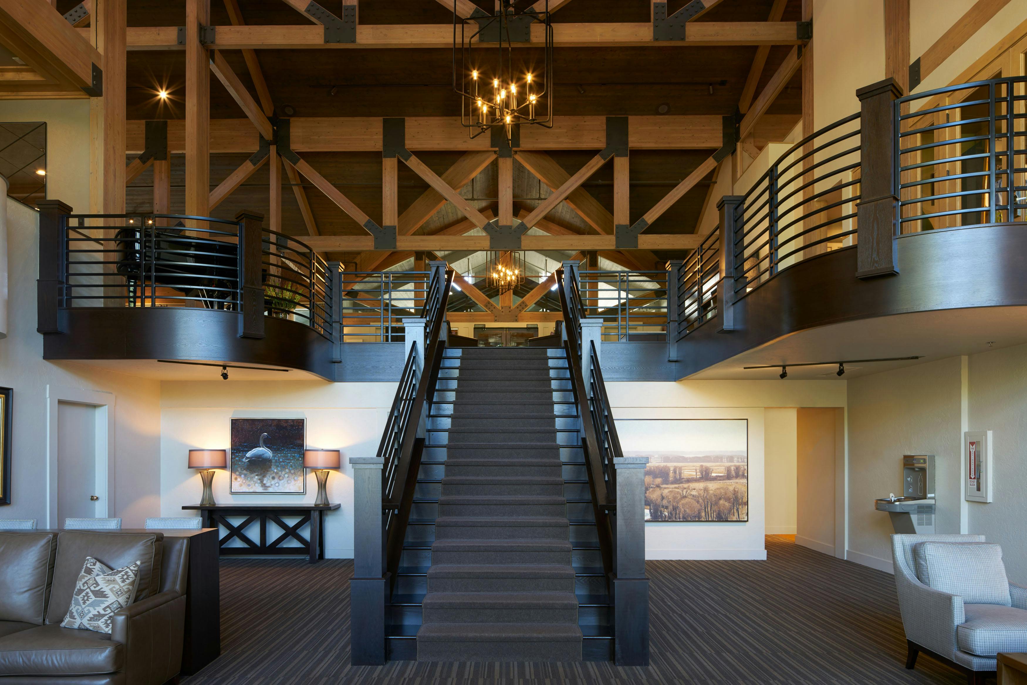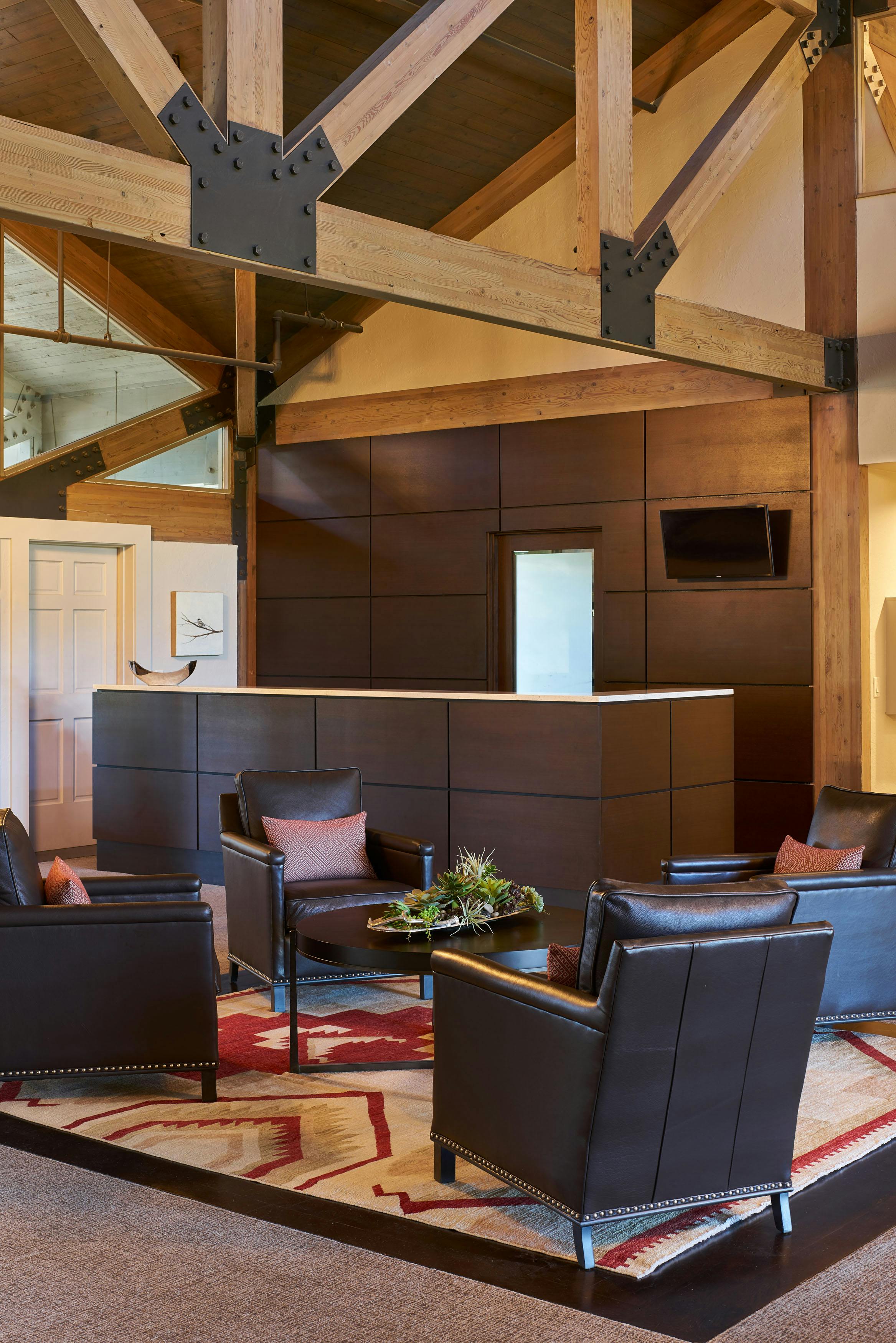 The members of Teton Pines were on a mission. They wanted to transform their traditionally adorned clubhouse into a transitional mountain retreat for current and new members. As is true with all commercial projects, adhering to a budget that allowed them to get the most value for their investment was extremely important. To help with costs, we kept the floor plan of the clubhouse the same but added more contemporary architectural elements and furniture with a warm taupe/red color palette. The dated river rock fireplace was replaced with a contemporary stacked stone. The bar was updated by refacing the perimeter in beautiful dark walnut, adding a crisp off-white veined quartz top, and installing a locally made custom-designed floating iron glass rack above the bar. The furnishings were replaced with sturdy, contemporary pieces that allowed their members to enjoy intimate spaces for dinner and cocktails.