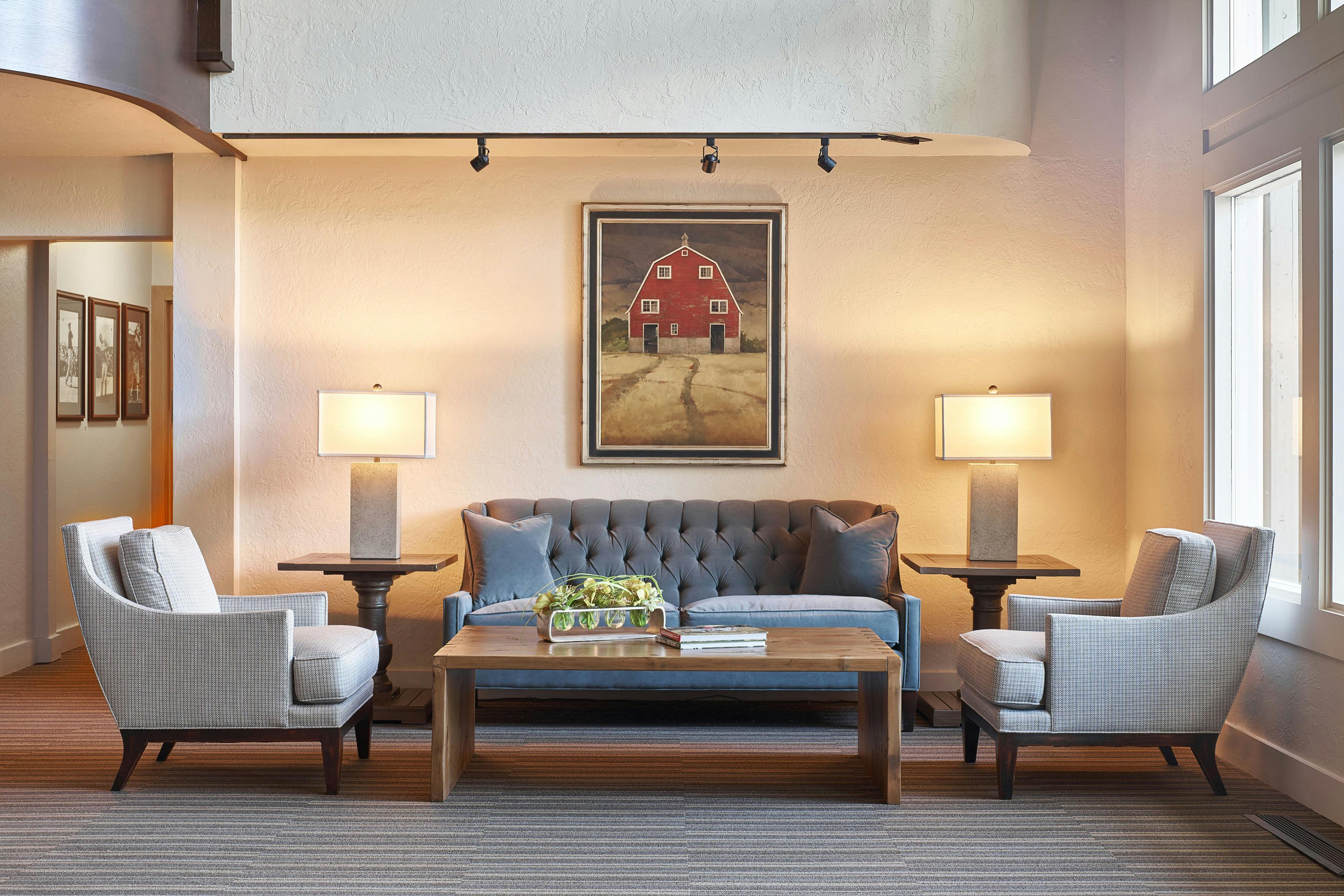 The members of Teton Pines were on a mission. They wanted to transform their traditionally adorned clubhouse into a transitional mountain retreat for current and new members. As is true with all commercial projects, adhering to a budget that allowed them to get the most value for their investment was extremely important. To help with costs, we kept the floor plan of the clubhouse the same but added more contemporary architectural elements and furniture with a warm taupe/red color palette. The dated river rock fireplace was replaced with a contemporary stacked stone. The bar was updated by refacing the perimeter in beautiful dark walnut, adding a crisp off-white veined quartz top, and installing a locally made custom-designed floating iron glass rack above the bar. The furnishings were replaced with sturdy, contemporary pieces that allowed their members to enjoy intimate spaces for dinner and cocktails.